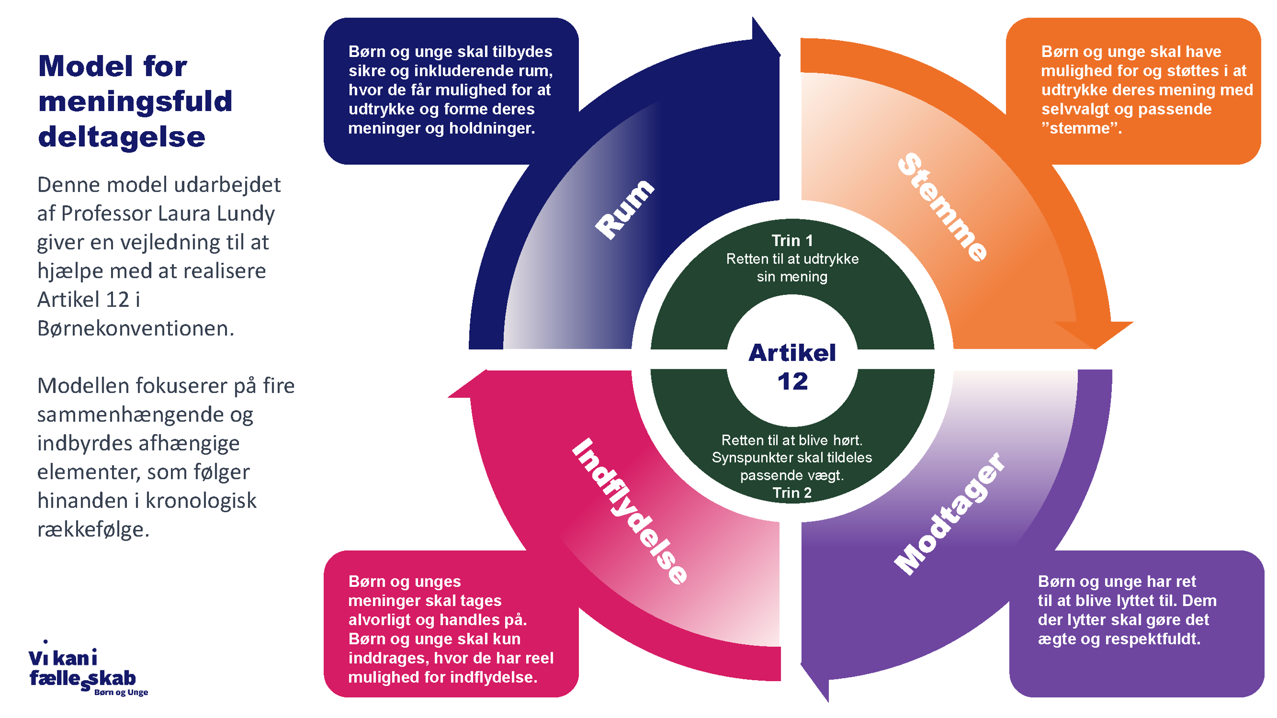 Denne model udarbejdet af Professer Laura Lundy giver en vejledning til at hjælpe med at realisere Artikel 12 i Børnekonventionen.