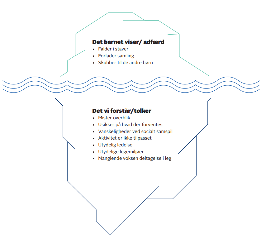 Isbjergmodellen er en grundtænkning i Nest-pædagogikken. Det er en metafor til at skabe forståelse for og indsigt i, hvad der ligger bag og motiverer børns synlige adfærd. Det, der er over overfladen, kan alle se. Det er børns observerbare adfærd og udtryk. Det, der ligger under overfladen, skal vi bruge vores pædagogiske faglighed til at forstå og arbejde med, dog med en opmærksomhed på, at vi i denne proces tolker og herved åbner og lukker for handlemuligheder. Det er børns forskellige forudsætninger, bevæggrunde og intentioner, set i samspil med konteksten. Modellen kan være med til at give nogle svar på, hvordan barnet bedst støttes i forhold til at blive en ligeværdig deltager i børnefællesskabet.